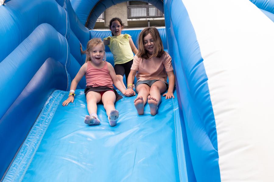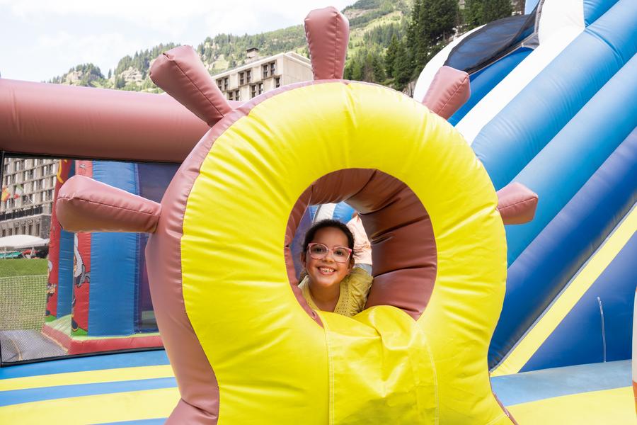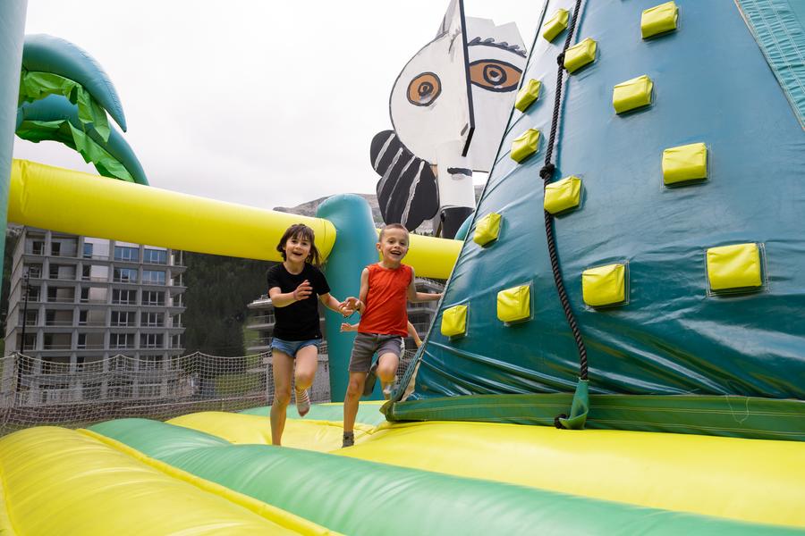 Le château gonflable est conçu pour offrir une expérience de jeu sûre et agréable. Pendant que les plus jeunes sautent, glissent et grimpent à l’intérieur des châteaux, les parents peuvent se détendre en admirant les panoramas spectaculaires des montagnes alentours.