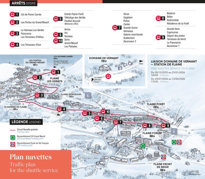 De halte van de gratis pendelbus is een essentieel verbindingspunt, zodat bezoekers en bewoners zich gemakkelijk kunnen verplaatsen tussen de verschillende niveaus van het resort. De halte bedient alleen de afdaling (van de Col de Pierre Carrée naar Flaine Forêt).
